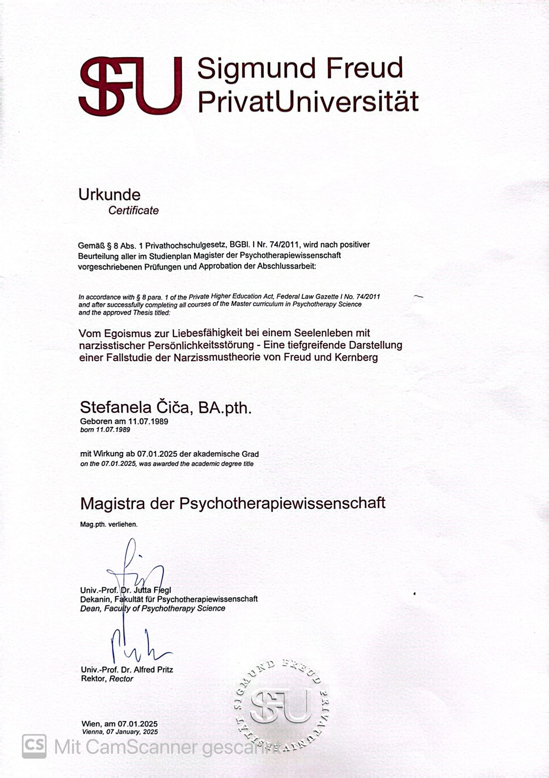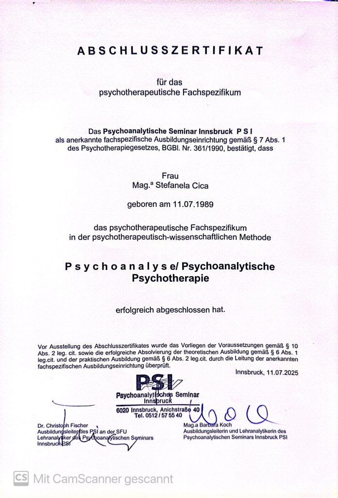 Ich habe Psychotherapiewissenschaften an der Sigmund Freud Privatuniversität in Wien und Psychoanalyse am Psychoanalytischen Seminar Innsbruck studiert.